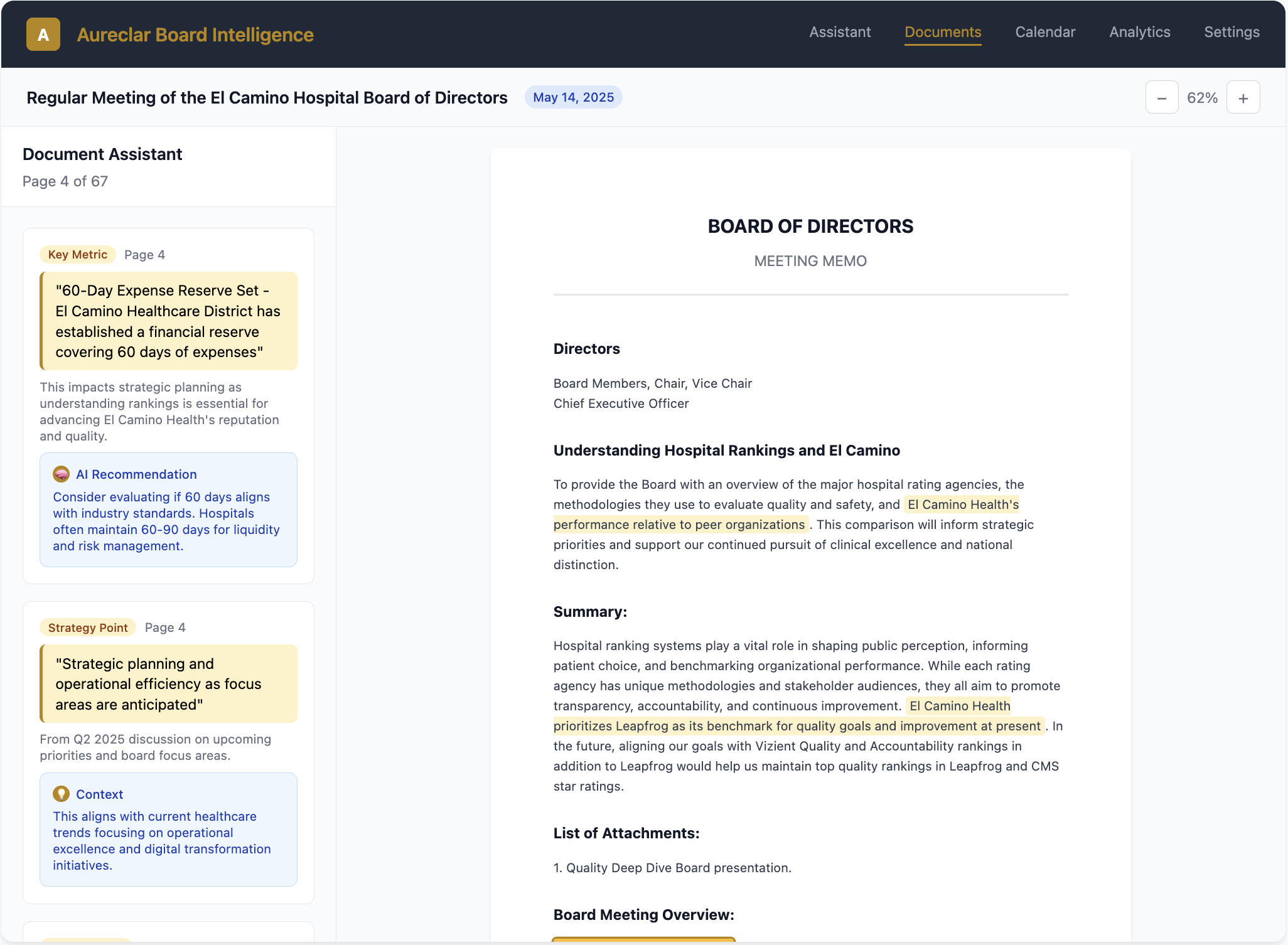 Aureclar's personalized AI assistant delivers tailored insights and context—helping board members prepare efficiently, ask informed questions, and decide with confidence.